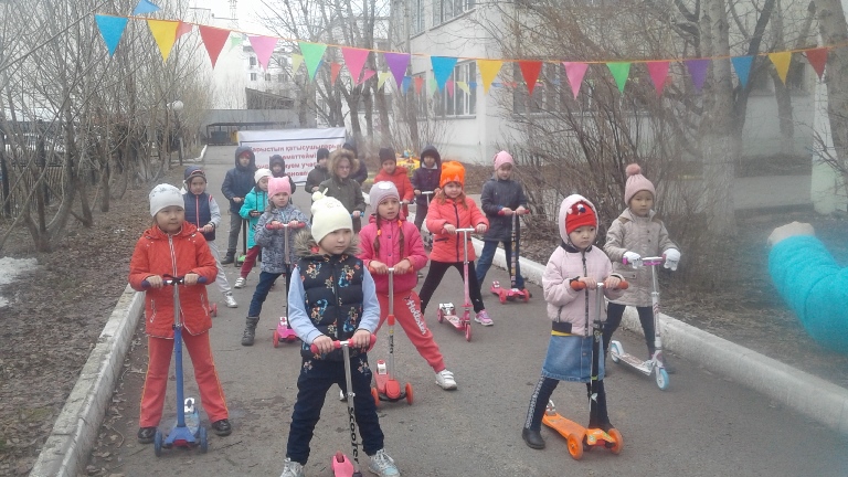 Креативная утренняя гимнастика на самокатах В честь всемирного Дня Здоровья воспитанники предшкольной группы «Масақ» показали нам креативную утреннюю гимнастику на самокатах. Дело в том, что все ребята в этой группе очень любят самокаты и считают что это самый лучший инвентарь для занятий спортом. МОЛОДЦЫ!!! ТАК держать!!!